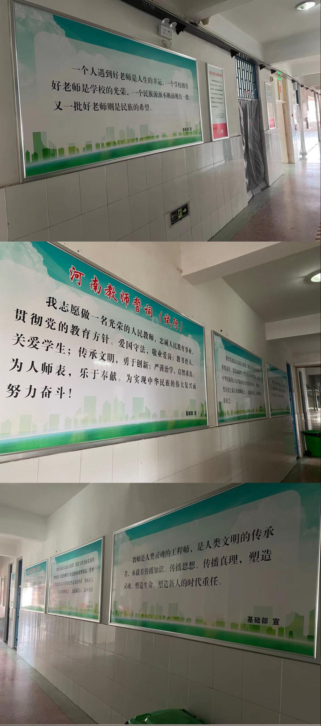近年来,基础部党支部在院党委的正确领导下,为圆满完成新形势下宣传思想工作的使命任务,始终坚持以习近平新时代中国特色社会主义思想和党的十九大精神为指导,增强“四个意识”、坚定“四个自信”、做到“两个维护”,自觉承担起举旗帜、聚民心、育新人、兴文化、展形象的使命任务,坚持正确政治方向,大力加强宣传思想工作阵地建设,在关键处、要害处下功夫,在工作质量和水平上下功夫,扎实推进该支部宣传思想工作不断强起来。国庆伊始,基础部党支部充分利用党建活动室、一教五楼走廊与楼梯间大力加强宣传思想工作阵地建设,分别建设了党史教育、尊师敬教、普通话推广宣传、廉洁从教以及社会主义精神文明建设等五大宣传思想阵地,推动宣传思想工作不断强起来,促进基础部全体教师在理想信念、价值理念、道德观念上紧紧团结在一起,坚定理想信念,努力工作,为进一步推进我院教育教学改革和整体工作高质量发展作出更大贡献。