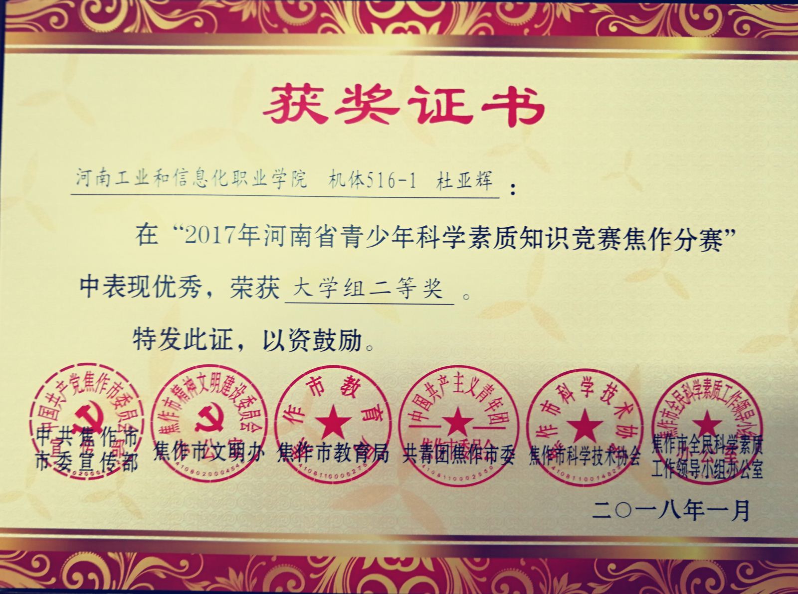 近日,2017年河南省青少年科学素质知识竞赛焦作分赛活动结果揭晓。在本次竞赛中,我院组织得当,表现突出,荣获多个奖项。其中学院喜获优秀组织单位奖;孟琪琪等6名同学荣获大学组一等奖,杜亚辉等30名同学荣获大学组二等奖,彩梦楠等55名同学荣获大学组三等奖。