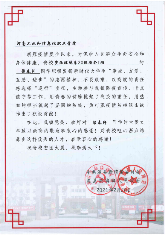 近日,我院收到了中共浚县新镇镇委员会、新镇镇人民政府寄来的感谢信,对我院资源环境系安全20-1班梁春轩同学在当地疫情防控志愿服务中作出的突出贡献予以表扬,并对我院的培养教育予以感谢。