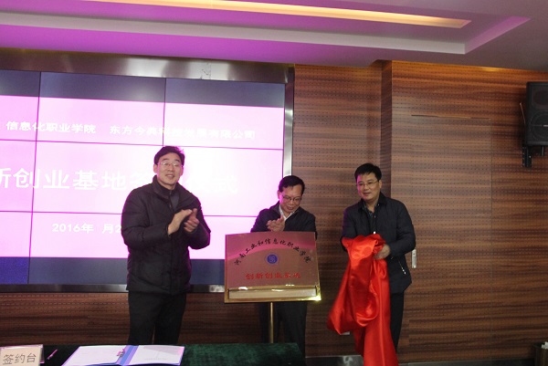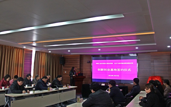 为积极响应李克强总理“大众创业、万众创新”的号召,扎实推进大学青年学生创新创业教育与实践活动,日前,我院与焦作东方今典科技发展有限公司校企共建大学生创新创业实践基地签约暨人才培养基地揭牌仪式在焦作科技总部新城创客空间隆重举行。焦作市城乡一体化示范区招商局局长高鸿,焦作科技总部新城项目总经理贾建军、副总经理涂哲,学院领导毋虎城、邱雨生出席揭牌仪式。