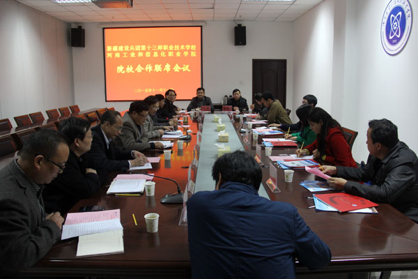 11月11日下午,新疆生产建设兵团第十三师职业技术学校校长曹明等一行6人来我院考察调研,双方就院校合作、对口援助等工作进行了深入交流。新疆生产建设兵团第十三师工信委主任朱新定、河南省工信委规划处白崇胜和院领导翟贵平、王海长、毋虎城等出席座谈会。