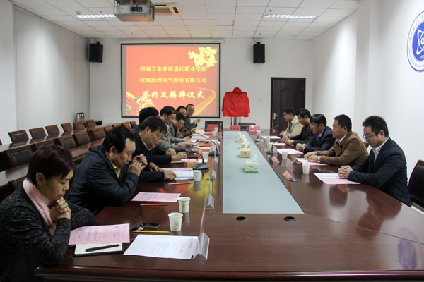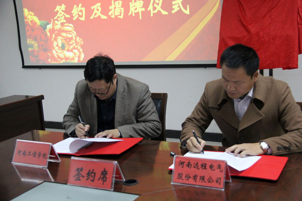 11月4日上午, 河南远程电气股份有限公司董事长程天刚一行5人来我院洽谈校企产学研合作等事宜。院领导翟贵平、毋虎城、邱雨生出席座谈会,双方举行了产学研合作签约及人才培养基地揭牌仪式。