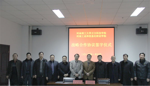 1月7日下午,我院与河南理工大学万方科技学院在第三会议室举行“战略合作协议”签字仪式。万方科技学院院长王裕清、党委书记王建中、常务副院长郑伦仁、党委副书记杨玉海及党政办公室副主任王建军、教务处处长邓乐、能源系主任王永建、党政办公室秘书科科长马艳,学院领导翟贵平、王海长、毋虎城、陈荣邦、席振修和校长助理邱雨生、吕况及全体中层干部参加了签字仪式。仪式由王海长主持。