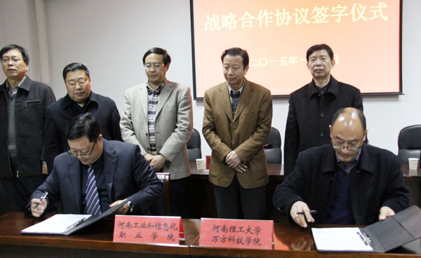 王裕清在讲话中指出,两个学院有着共同的成长经历,同在焦作,地域优势明显,以前都曾同属于一个系统和行业,开设的专业相近,这种特殊的渊源使得两个学院有着密不可分的亲缘关系。两所学院在新的历史条件下,面临的形势、任务、压力相同。万方科技学院作为一个本科院校,也希望能够借鉴河南工信学院的一些管理经验和教学资源促进自身的发展。通过今天的签约仪式,相信两个学院在以后的合作中会更加深入,更加规范,更加有序,更好地服务煤炭行业,服务地方经济,办好人民满意的教育。