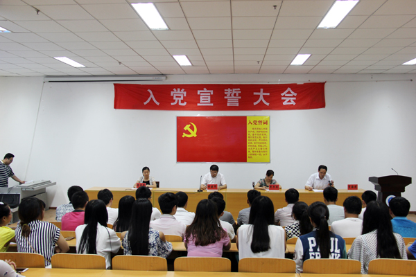 大会在国际歌声中拉开序幕。首先,组织人事处李海清同志宣读了我院2014年转正人员名单及新发展人员名单。然后,30位新发展党员面对鲜艳的党旗,在领誓人李雪莲同志带领下庄严宣誓,贺子杏同志监誓。接下来由祝慧宁同志代表新党员发言。最后,黄建军同志发表讲话。黄书记首先对新发展党员表示祝贺,然后给新发展党员提出三个希望,希望大家能继续加强对政治的学习,关心国家发展,提高个人的政治素养;希望大家能认真学习专业知识,认真对待考试,起好先锋模范作用;希望大家平时严格要求自己,规范自己的行为,做个有修养的人。