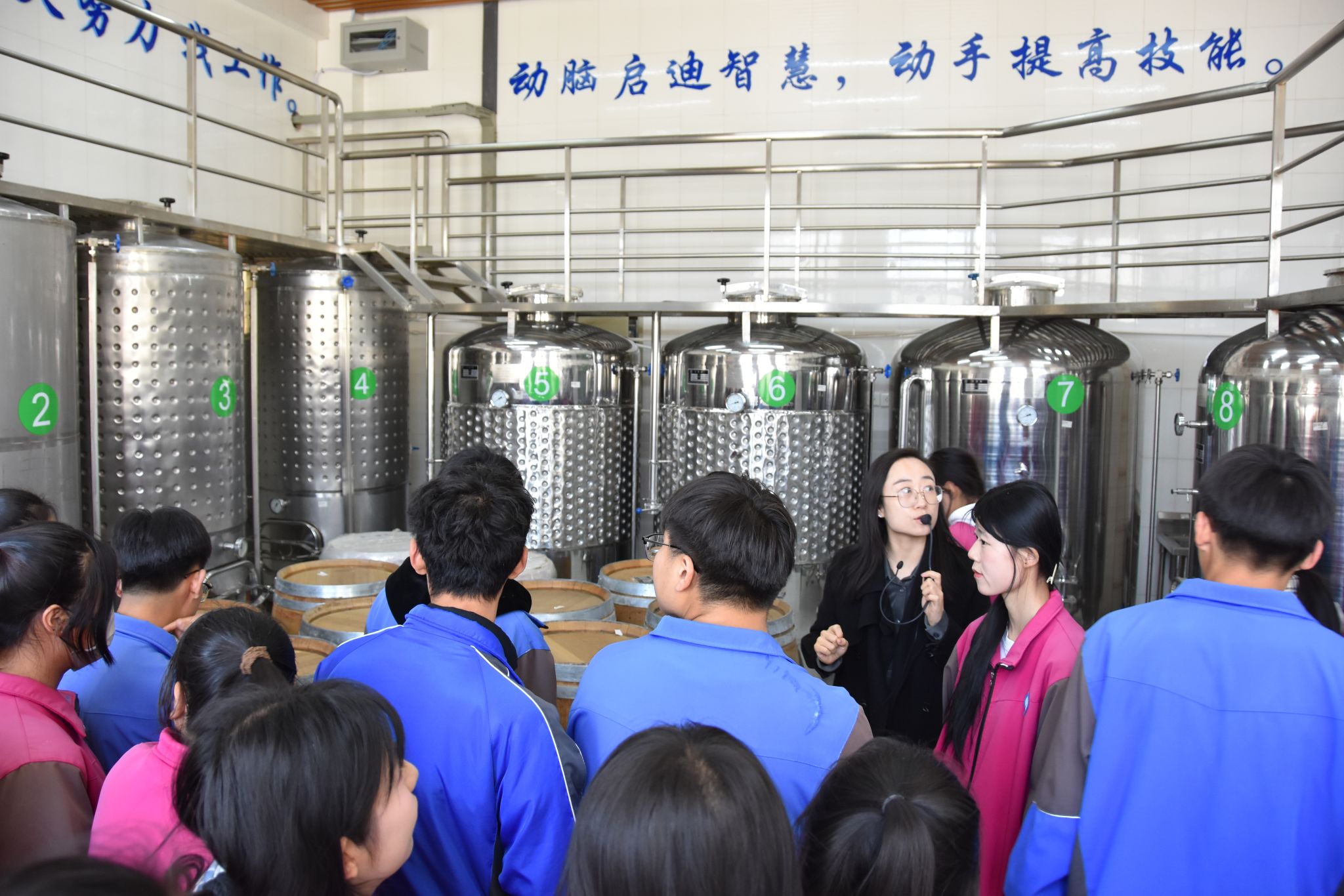 随后,研学队伍来到学校葡萄酒生产实训车间。同学们亲手触摸酿酒器具、嗅闻葡萄果香与酒香,真切感受葡萄酒酿造的独特魅力,对食品发酵领域有了更直观、深入的认知。