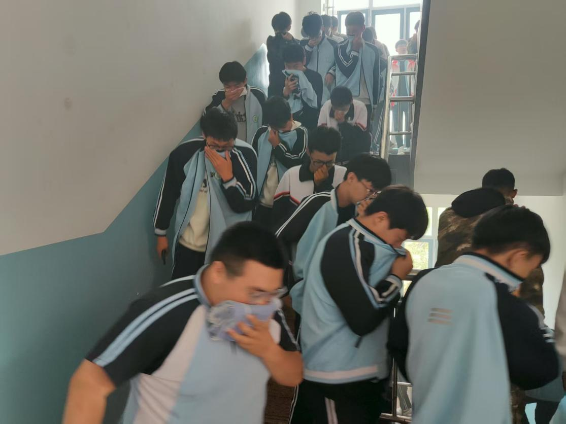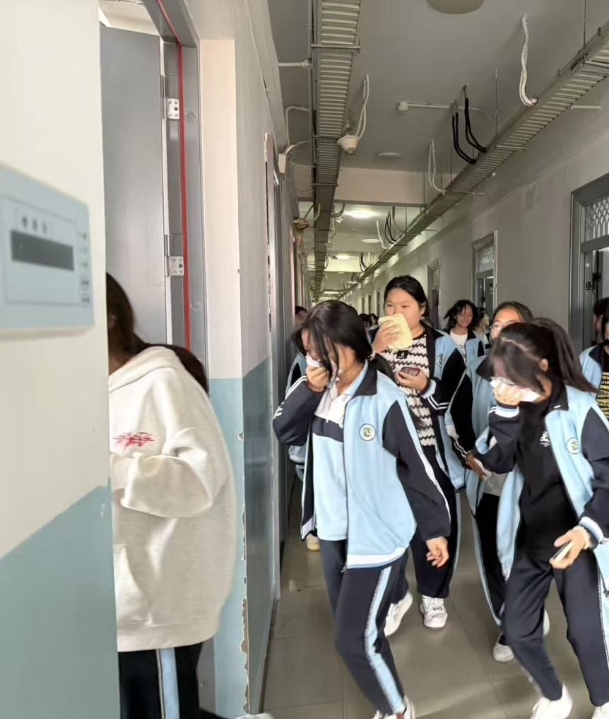 下午4时,宿舍区火警警报响起,演练正式开始。点位教师提醒学生“弯腰、捂鼻、贴墙走”。学生们迅速反应,用湿毛巾捂住口鼻,避开宿舍门口堆积的杂物,沿着安全标识快速下楼集结。学生干部主动引导,避免拥挤,所有学生3分钟内便撤离至安全区域。在集合点,各班级快速整队、清点人数,疏散过程高效顺畅,实现预期演练目标。