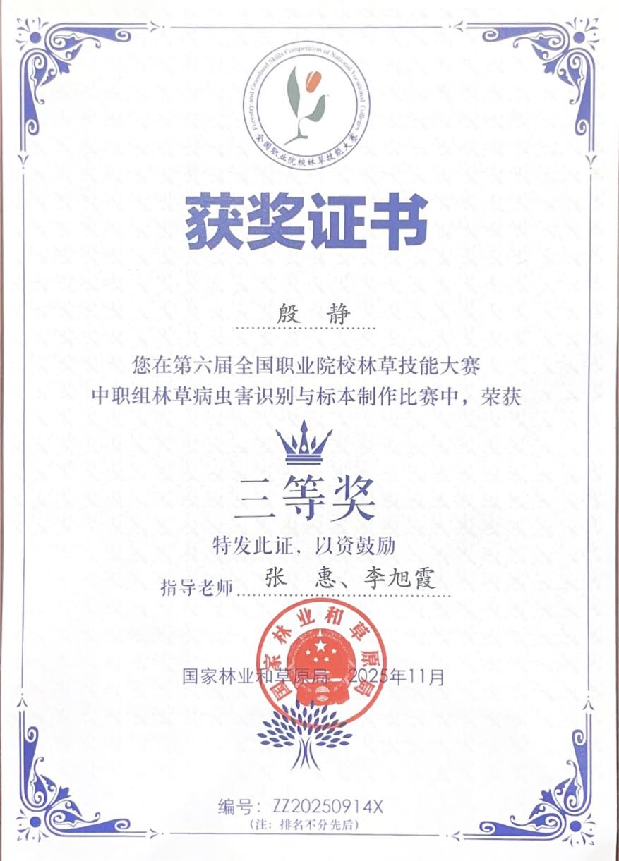 我校设施农业教研室张惠、李旭霞老师指导的2023级园林技术专业的殷静同学经过图片鉴定病虫害种类、镜检鉴定病虫害种类与病原永久玻片、干标本鉴定病虫害种类、标本制作竞赛4个比赛环节的激烈角逐,最终荣获比赛三等奖。