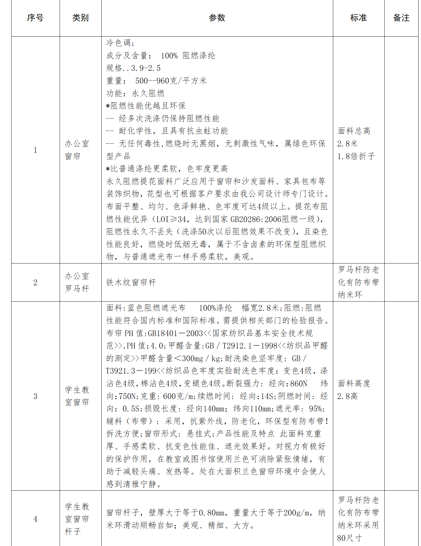 近年来,我校教学楼窗帘问题日益凸显,已严重影响到了师生的工作和学习环境。窗帘布料老旧,罗马杆损坏严重,现需对教学楼窗帘进行更换,其中更换窗帘962米,罗马杆533.2米,具体参数如下: