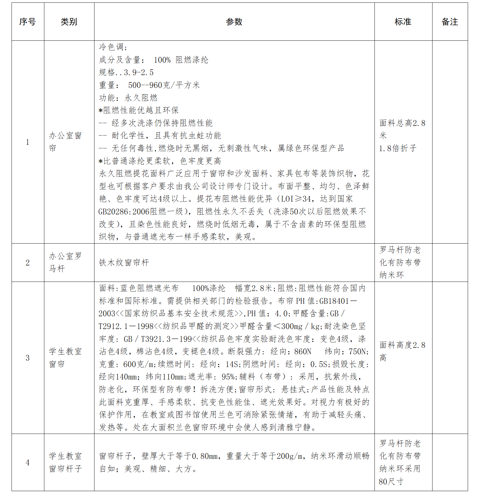 近年来,我校教学楼窗帘问题日益凸显,已严重影响到了师生的工作和学习环境。窗帘布料老旧,罗马杆损坏严重,现需对教学楼窗帘进行更换,其中更换窗帘962米,罗马杆533.2米,具体参数如下: