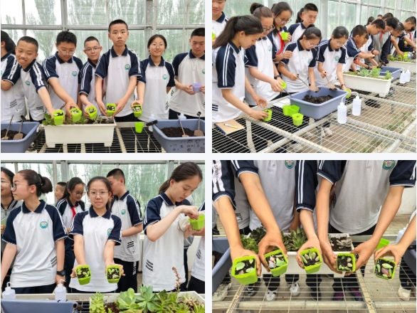 参观结束后,学生们迎来了充满趣味的多肉植物种植体验环节。孟老师现场示范填土、栽种、铺面的技巧,学生们小心翼翼地填土、栽种、浇水,亲手种下属于自己的“绿色小天地”。在实践过程中,同学们认真专注,不仅掌握了多肉植物养护知识,更在实践中体会到劳动的乐趣与成就感