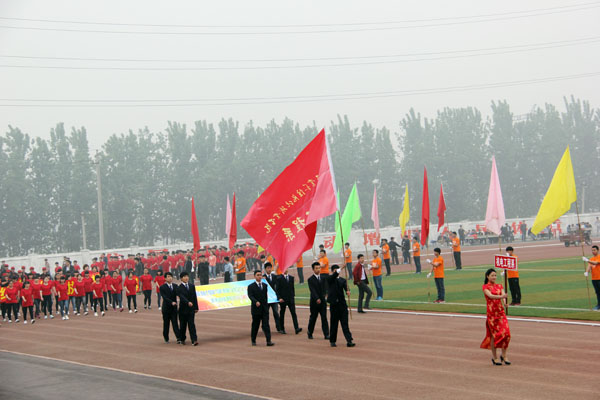 开幕式上,副校长毋虎城致开幕词。他首先代表学院党政领导及全校教职员工向运动员、裁判员致以亲切的问候和崇高的敬意!向为本次田径运动会筹备工作付出辛勤劳动的工作人员表示衷心的感谢!毋校长说,2014年是我院实施“十二五”规划的爬坡赶超年,是我院全面落实“三年行动计划”的关键年,也是我院继续深化教育教学改革,全面实施“教学质量工程”活动年;组织和举办好本届田径运动会,是对我院党的群众路线教育实践活动成果的一次检验,是对广大师生员工弘扬学院精神,增强集体荣誉感和凝聚力的一次动员;对进一步细化、落实“三年行动计划”,对进一步深化教育教学改革,全面提高教育教学质量,进一步加强精细化管理,有着十分重要的意义。希望全体裁判员恪尽职守、严肃认真、秉公评判;希望全体运动员要以饱满的精神、昂扬的斗志、顽强的毅力投身每场赛事,安全参赛、文明参赛、规范参赛;希望全体工作人员要认真维护安全、积极工作、热情服务。之后,运动员代表和裁判员代表分别代表运动员和裁判员进行了宣誓,他们表示将严格遵守竞赛规则和裁判员纪律,发扬团结协作、顽强拼搏、奋勇争先的精神,圆满完成各项比赛任务。各系、区代表队献上了精彩太极拳表演,充分展现出力与美及当代大学生积极进取的精神风貌。精彩的表演赢得了场上观众们热烈的掌声和欢呼声!