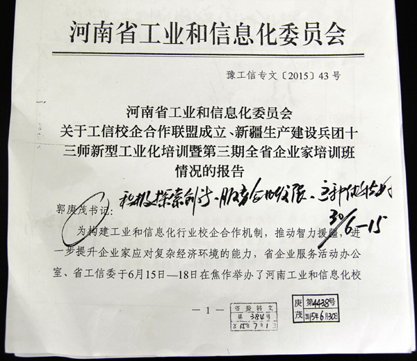 为构建工业和信息化行业校企合作新机制,推动智力援疆,进一步提升企业家应对复杂经济环境的能力,省工信委、省企业服务活动办公室于6月15日—18日在焦作举办了河南工业和信息化校企合作联盟成立大会、“双百”企业进焦作暨第三期企业家培训班,校企合作联盟成立大会暨第三期企业家培训班开班典礼于6月15日在我院成功举办。受省工信委委托,我院于6月8日—18日成功承办了新疆生产建设兵团十三师新型工业化培训班。上述活动得到了省委、省政府领导的充分肯定。省委书记郭庚茂、副省长王艳玲先后在省工信委呈报的“关于工信校企合作联盟成立、新疆生产建设兵团十三师新型工业化培训暨第三期全省企业家培训班情况的报告”上作出重要批示。