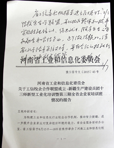 省委省政府领导分别就工信校企合作联盟成立及企业家培训班等工作作出重要批示