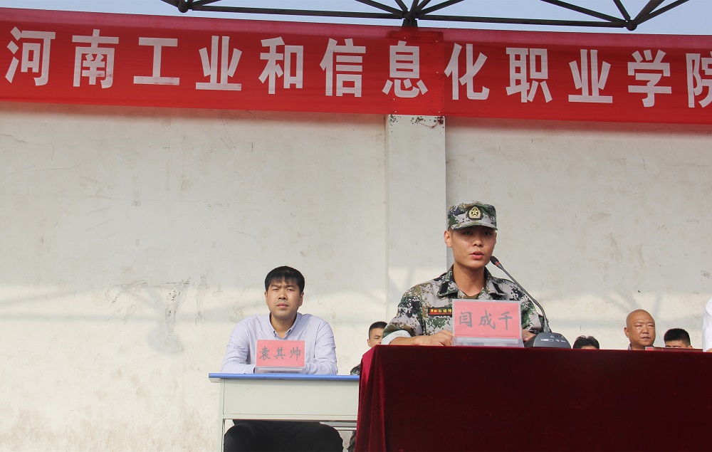 教官闫成千代表承训部队发言,他对全体教官和受训新生提出了具体的希望和要求。他表示,军训是加强国防教育和学生自身素质建设、更好应对各种挑战的难得机会,要求所有承训官兵认真履行职责、科学筹划、严密组织、保障安全;希望同学们增强国防意识和组织纪律性,磨练意志,奋发图强,圆满完成各项军训任务。