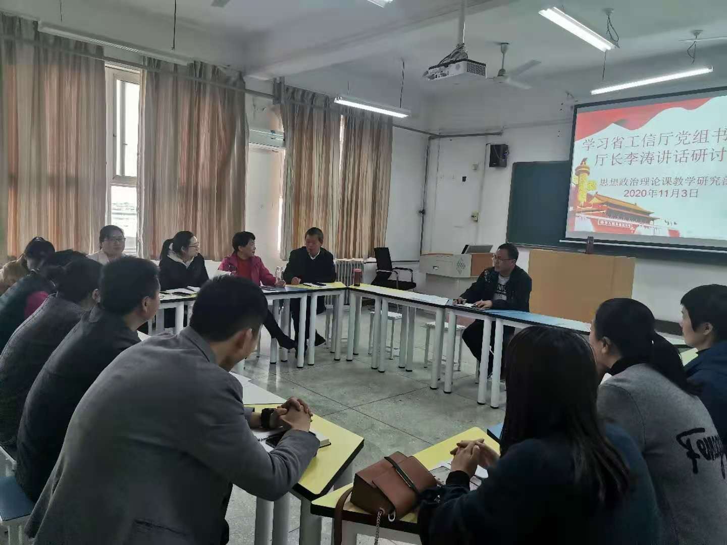 11月3日下午,思政部党支部利用主题党日活动时间召开了一场别开生面的研讨会,对省工信厅党组书记、厅长李涛同志为厅属院校师生上的一堂思政课进行了专题研讨。研讨会由思政部主任贾超群同志主持。