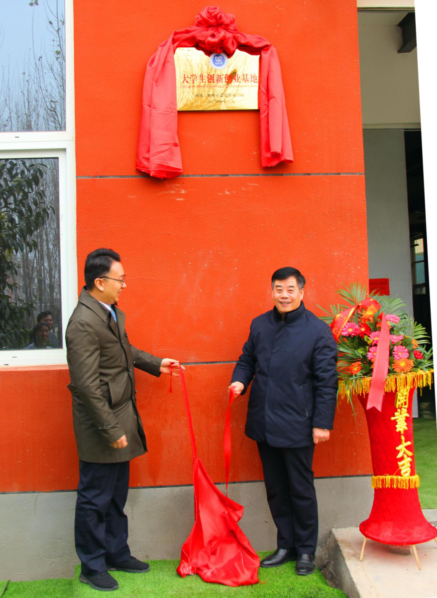 焦洪涛、杨亮分别代表校企双方签约,并共同为双创基地揭牌。