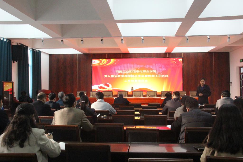 会议要求,一要认真纠治、不走过场。认真学习贯彻全省教育系统全面从严治党暨整治群众身边腐败和不正之风工作推进会精神,坚持综合施策、系统治理,确保活动取得成效。二要严格程序,确保质量。按照《河南工业和信息化职业学院纠治教师师德失范专项活动实施方案》的任务分工和进度安排,坚持上下联动、统筹协调,高质量完成各项工作任务。三要坚持开门整治、接受群众监督。把开展整治教育领域群众身边腐败和不正之风专项活动作为党史学习教育“我为群众办实事”实践活动和校园精神文明创建的重要载体,扎实开展纠治工作,全面加强学院师德师风建设。