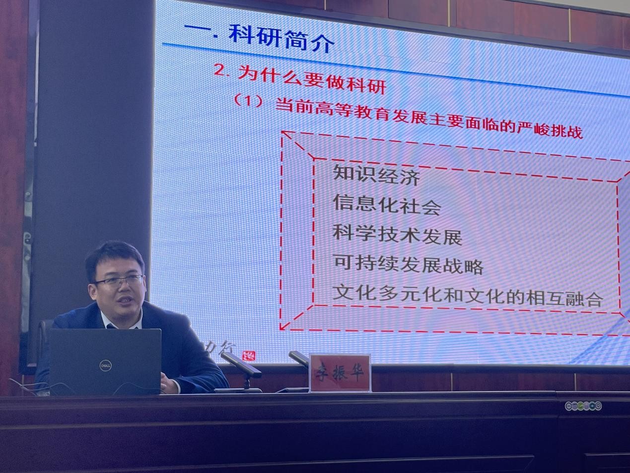 李振华以“高校科研项目申请与奖励申报”为主题,围绕科研简介、科研项目分类、科研项目申请、科研奖励申报四个方面,以“什么是科研”“为什么要做科研”为切入点精辟分析了高校科研的现状,指出无论是高校自身发展和教育教学改革的需要,还是教师队伍建设的需要,都要求新时代高校教师积极投身科学研究工作。