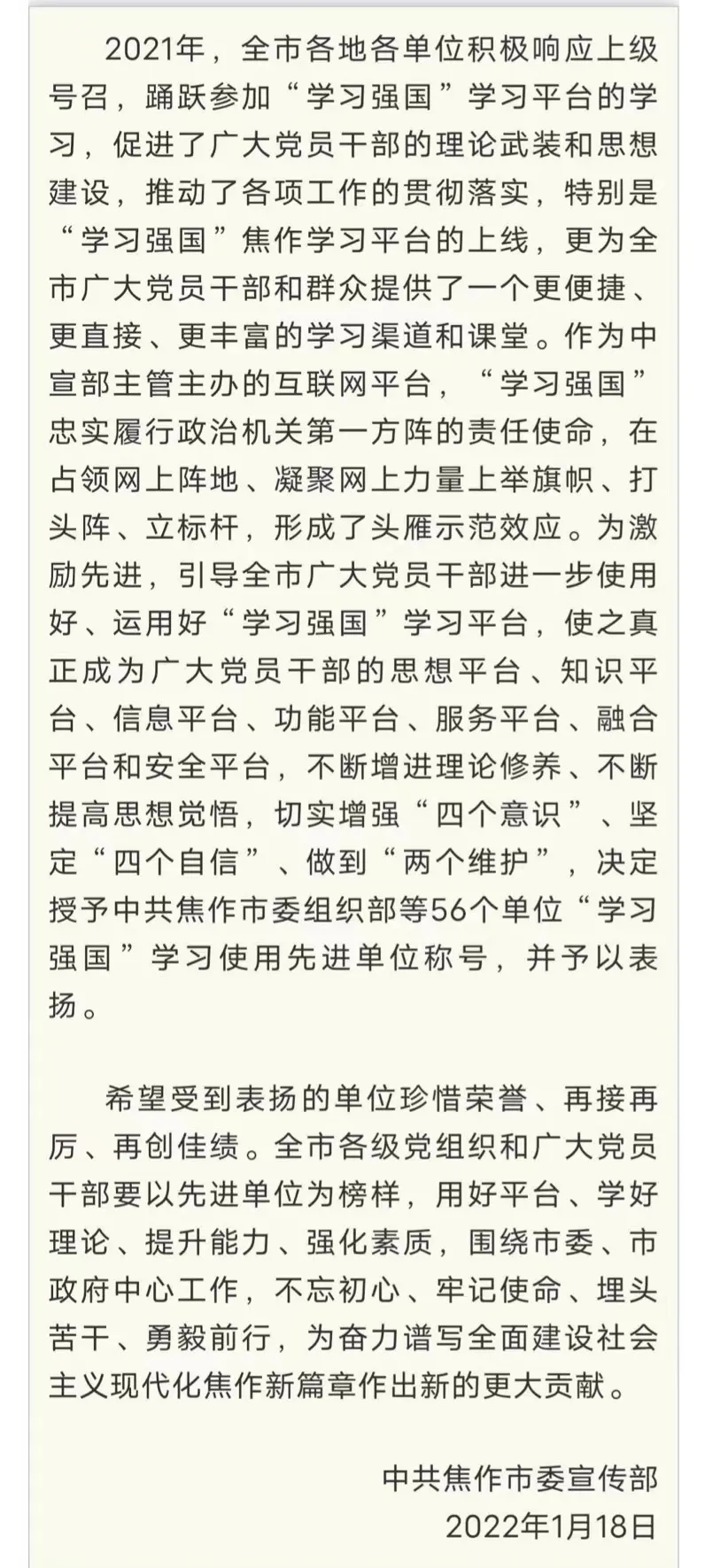 1月18日,焦作市委宣传部下发《关于表扬焦作市2021年度“学习强国”学习使用先进单位的通知》,对全市56家单位进行了表扬,我院喜获焦作市2021年度“学习强国”学习使用先进单位称号。