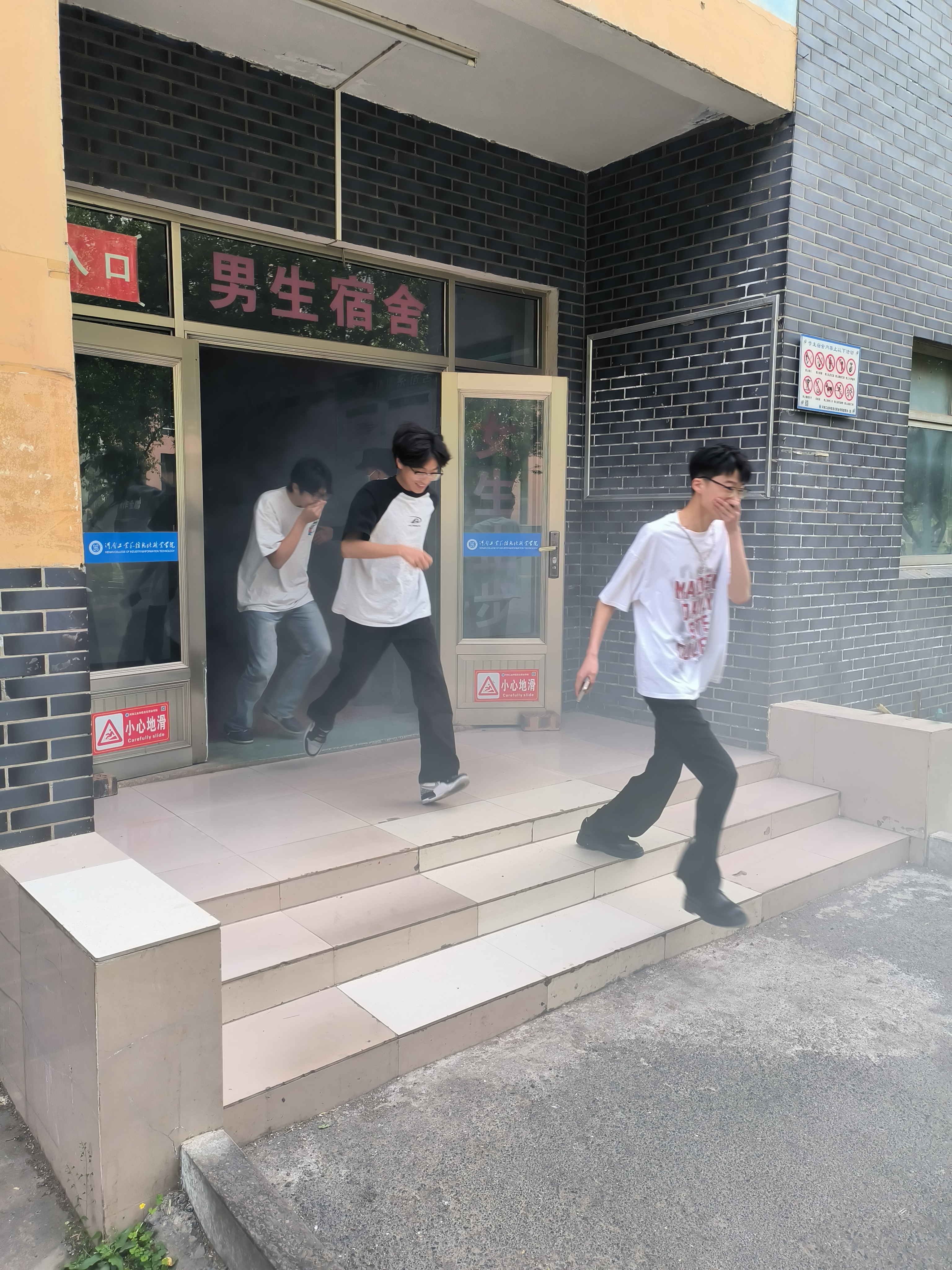 下午13:45,武装部(保卫处)工作人员在宿舍楼部分楼层投放无毒烟雾弹,消防声光警报响起,演练正式开始。学生有序撤离,消防协会成员在指定岗位协助。仅用时3分钟,全体师生安全抵达指定地点。结束后,工作人员和二级学院老师检查各宿舍,确保无学生滞留。