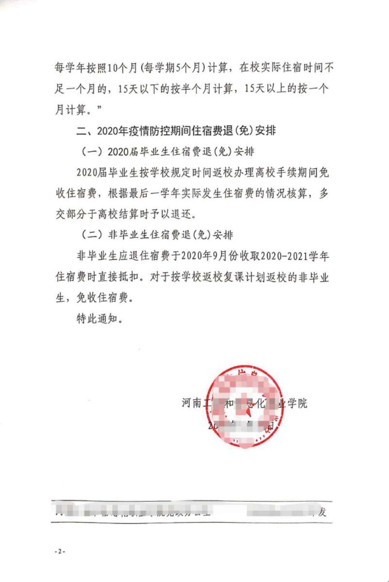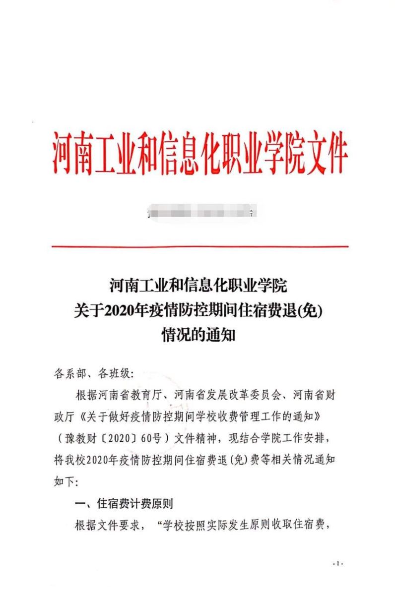河南工业和信息化职业学院关于2020年疫情防控期间住宿费退(免)情况的通知公告