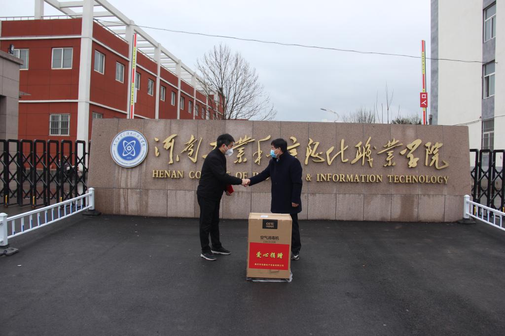 3月25日下午,焦作市海康电子设备有限公司向我院捐赠了价值万余元的AOE冠状病毒消毒机,助力学院新冠肺炎疫情防控工作。院长焦洪涛代表学院接受捐赠,办公室主任赵少华参加捐赠仪式。