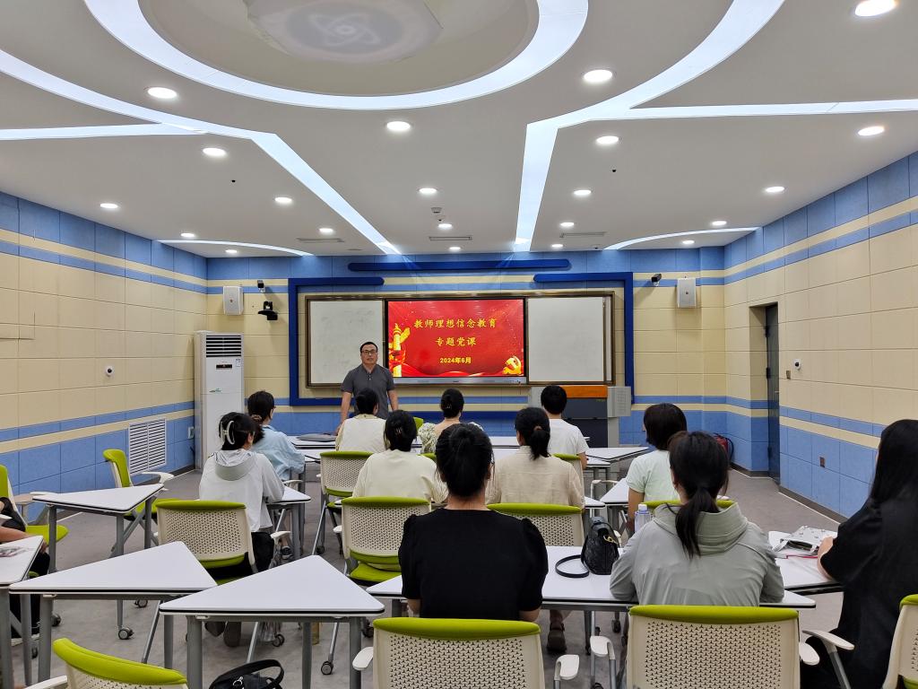 在建党103周年来临之际,为进一步巩固“党纪学习教育”主题教育成果,坚定思政课教师的理想信念,6月18日,思政部党支部书记贾超群在智慧教室讲授《教师理想信念教育》专题党课,引导思政课教师坚定理想信念,做对党忠诚为党尽责的合格党员。