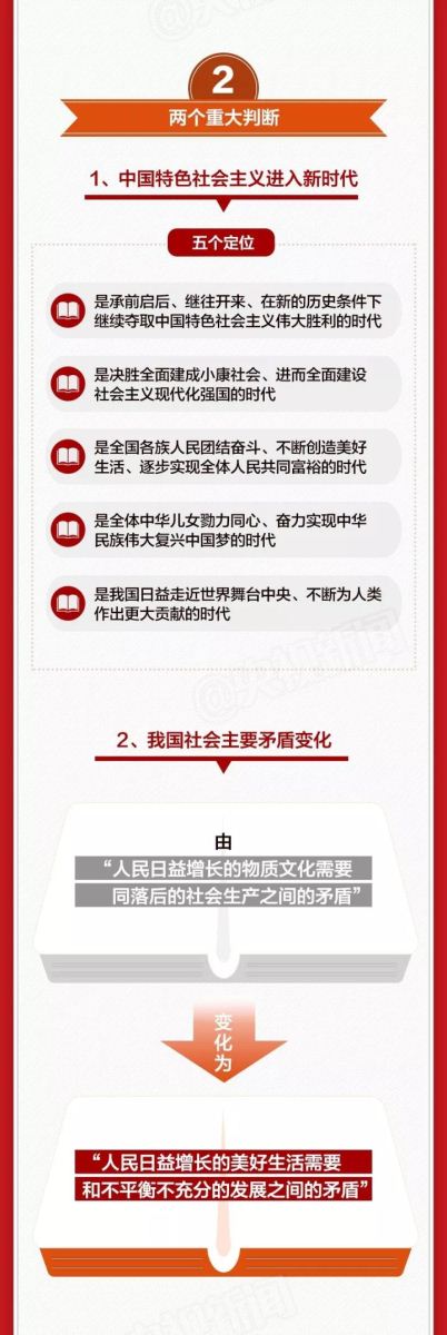 这是十九大报告作出的一个重大判断。十九大报告阐述了这个新时代三个层面的意义和五个方面的定位。与中国特色社会主义进入新时代相应,我国社会主要矛盾也发生转化。
