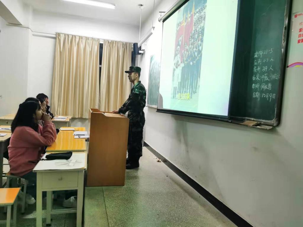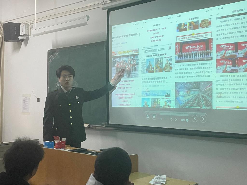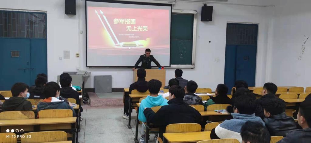 为进一步做好学院2022年征兵工作,充分发挥退伍复学学生的作用,自12月6日起,学院退伍军人服务社的退伍复学的学生利用晚自习进行为期两周的国防知识宣讲。退伍复学学生结合自身在部队服役实际,为在校大学生进行国防知识宣传,通过本次活动的开展,进一步增强了大学生热爱祖国、建设祖国、保卫祖国的意识,激发广大学生的爱国情感,增强了广大学生的国防意识。同时,以国防教育、爱国主义教育为引领,让广大学生深刻理解"国无防不立,民无兵不安"的重大意义,牢固树立"居安思危"的意识,激发了大学生征兵入伍的热情,为学院征兵工作打下良好基础。
