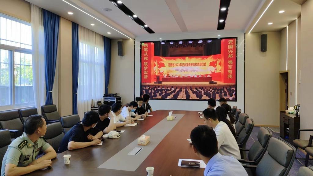 为深入贯彻习近平强军思想,巩固发挥高校征兵主阵地作用,提升大学生征集质效,推动兵员强省建设,根据全国及河南省普通高等学校毕业生就业创业工作电视电话会议精神,积极鼓励大学毕业生参军入伍,6月13日上午,河南省人民政府、河南省军区在黄河科技学院组织“河南省2023年征兵宣传进高校启动仪式”。我院在行政楼第三会议室设立分会场,副院长张庆伟、学生工作部部长丁军猛、示范区人武部部长卢千、学生工作部武装部干事和各系部、二级学院征兵辅导员参加会议,全体毕业生通过线上观看直播。