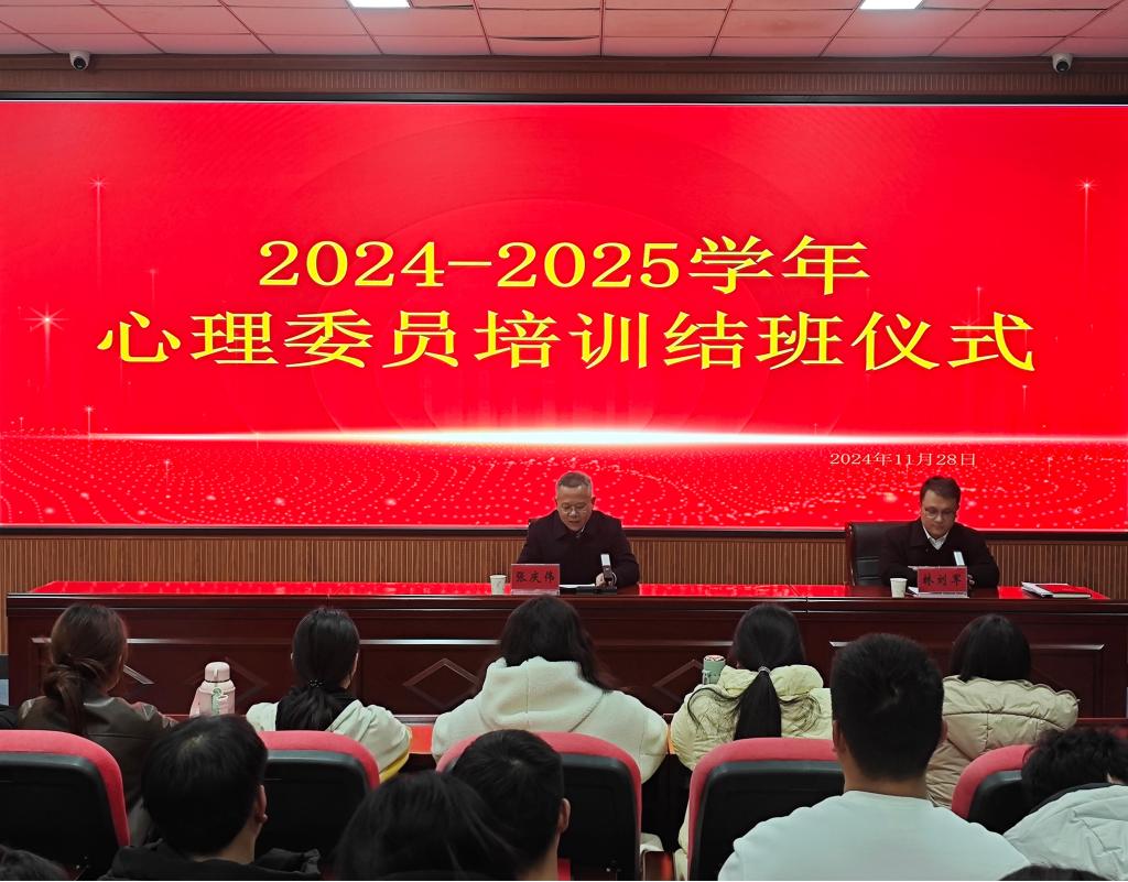 为深入学习贯彻党的二十届三中全会精神,贯彻落实习近平总书记关于加强学生心理健康教育工作的重要指示批示精神,进一步强化全省高校心理育人工作成效,提升大学生心理健康素养,切实加强和改进新时代我校师生心理健康教育工作,提升我校心理育人质量,进一步提升我校学生管理工作水平,提高心理委员的思想认识水平,明确心理健康教育工作的重要性,了解相关心理知识,初步掌握大学生常见心理问题的表现和应对措施,熟悉心理委员的工作职责,学习自我调节并能更好的保证班级同学的心理健康状况。2024年11月28日下午,2024-2025学年心理委员培训结班仪式在我校第四会议室举行,出席会议的有河南工业和信息化职业学院副院长张庆伟,会议由学生工作部部长林刘军主持。