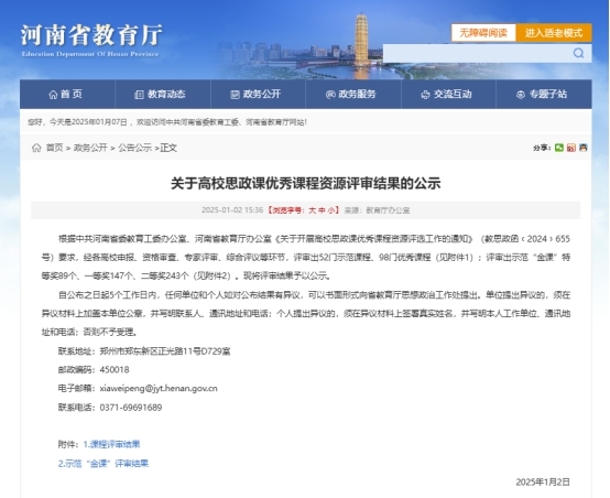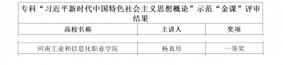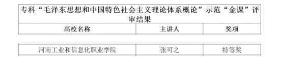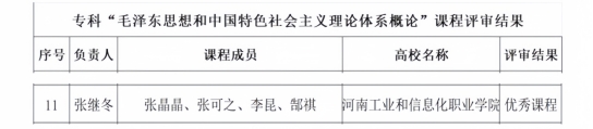 近日,河南省教育厅公示了高校思政课优秀课程资源评审结果,我校推荐的2门思政课入选优秀课程。在示范“金课”评选中,张可之获特等奖,张涵、杨真珍分别获得一等奖,任艳华获得二等奖。