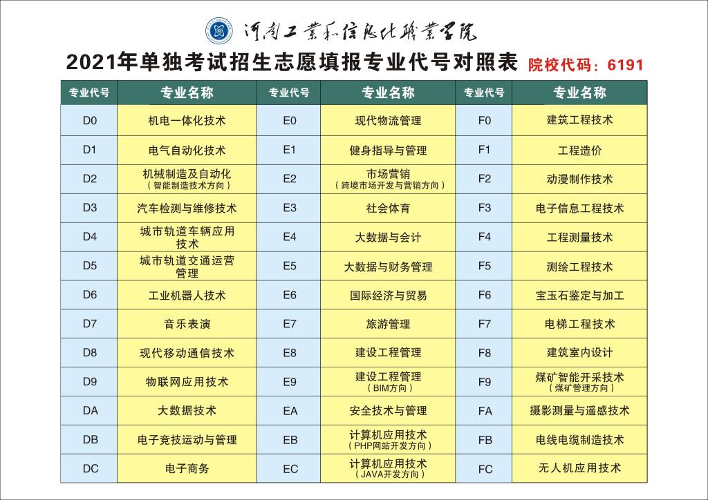 河南工业和信息化职业学院2021年单独考试招生志愿填报专业代号对照表