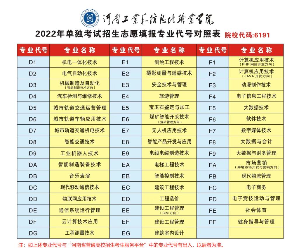 河南工业和信息化职业学院2022年单独考试招生志愿填报专业代号对照表