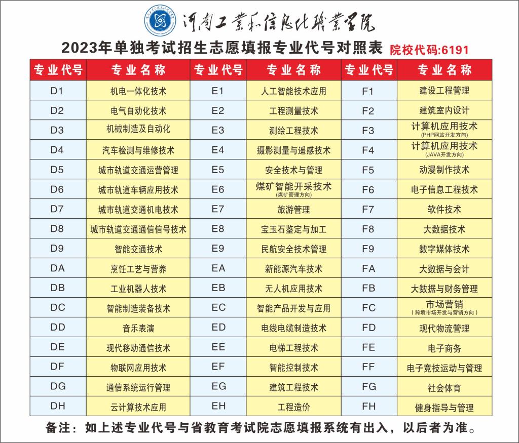 河南工业和信息化职业学院2023年单独考试招生志愿填报专业代号对照表