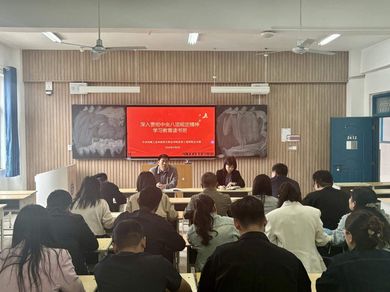 为持之以恒正风肃纪,推动中央八项规定精神入脑入心、见行见效。4月8日,信息工程学院党总支举办深入贯彻中央八项规定精神学习教育读书班,全体党员以学铸魂、以学促干,凝聚起风清气正的奋进力量。
